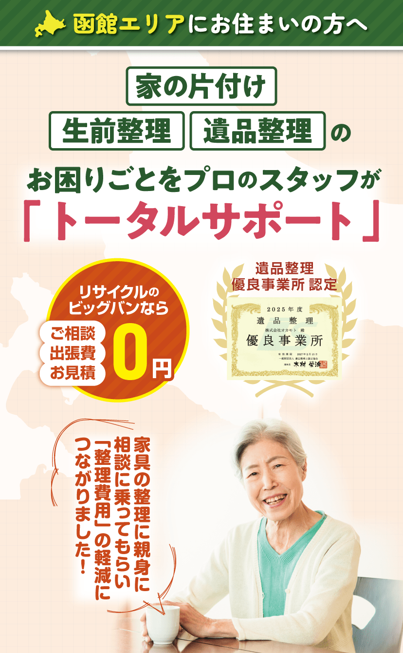 総合型のリサイクルショップを函館市内で展開しており、地域一番の売り場面積を持っています。整理見積には専門のスタッフがお伺いし、価値ある品はお買取させていただきます。